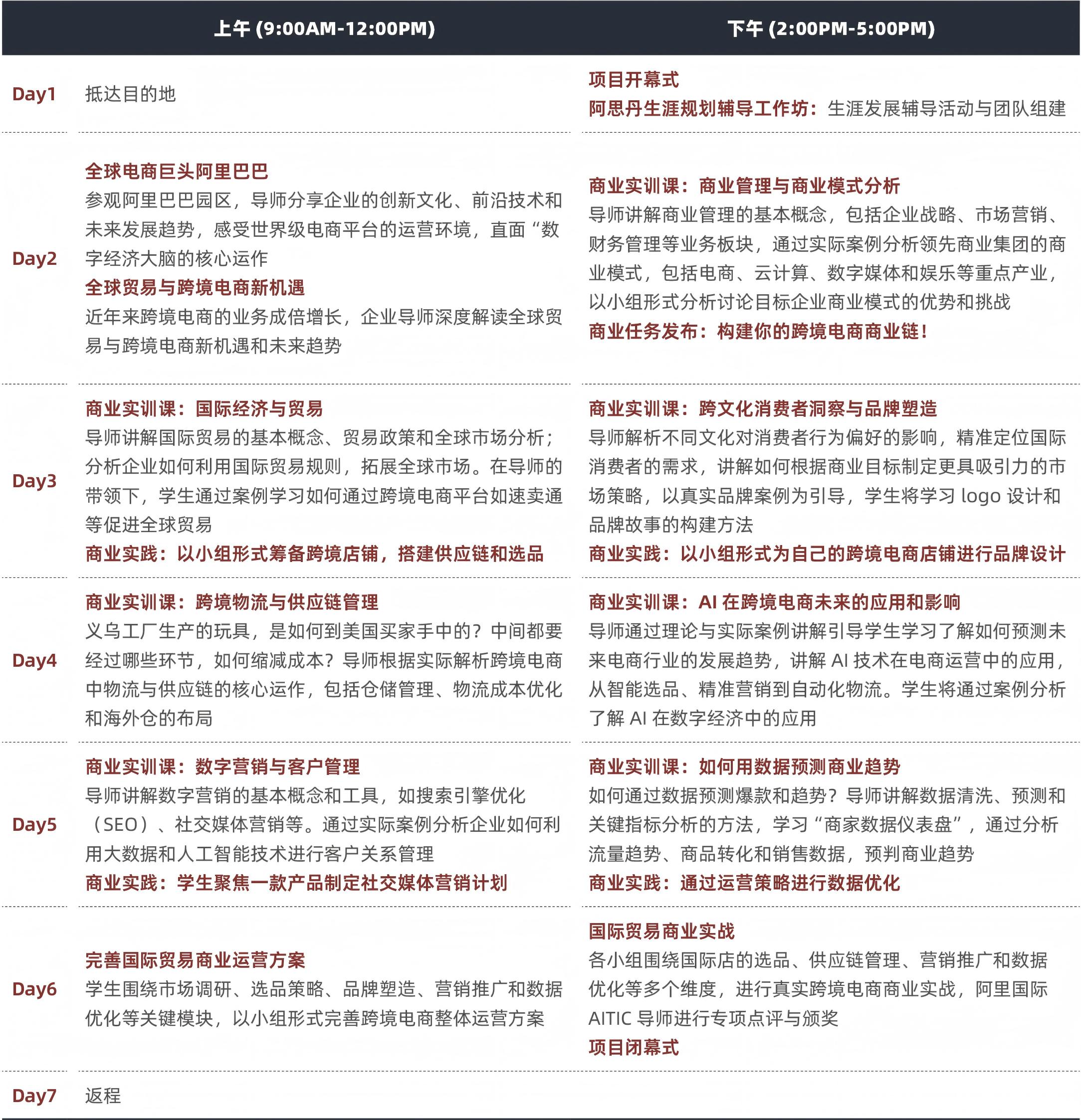 在快速发展的全球商业世界中,国际贸易与供应链全球化共同推动着全球经济的发展,科技的进步迭代是国际贸易发展的强大助推器,同时互联网的全球升级让跨境电商行业在全球范围内蓬勃发展,与之对应的国际经济与贸易,供应链管理,电子商务,数字营销等相关商科专业也成为了大学专业热门的申请方向。阿思丹与阿里巴巴国际数字商业集团人工智能人才孵化中心 (AITIC) 合作推出国际贸易与全球跨境电商项目,由行业一线导师与专家带领学生在企业开展沉浸式专业实践,深入参访全球电商巨头阿里国际AITIC亲历世界级电商平台的运营环境,直面“数字经济大脑”的核心运作,探索行业先进技术和供应链创新模式。系统学习国际贸易与跨境电商专业方向知识,进行供应链搭建,跨境物流商品管理,制定数字营销方案等实践模拟,最终完成国际贸易模拟商业实战。完成项目任务可获阿里国际 AITIC 签发项目参与证书,优秀个人有机会获得AITIC导师签发推荐信,助力大学申请。