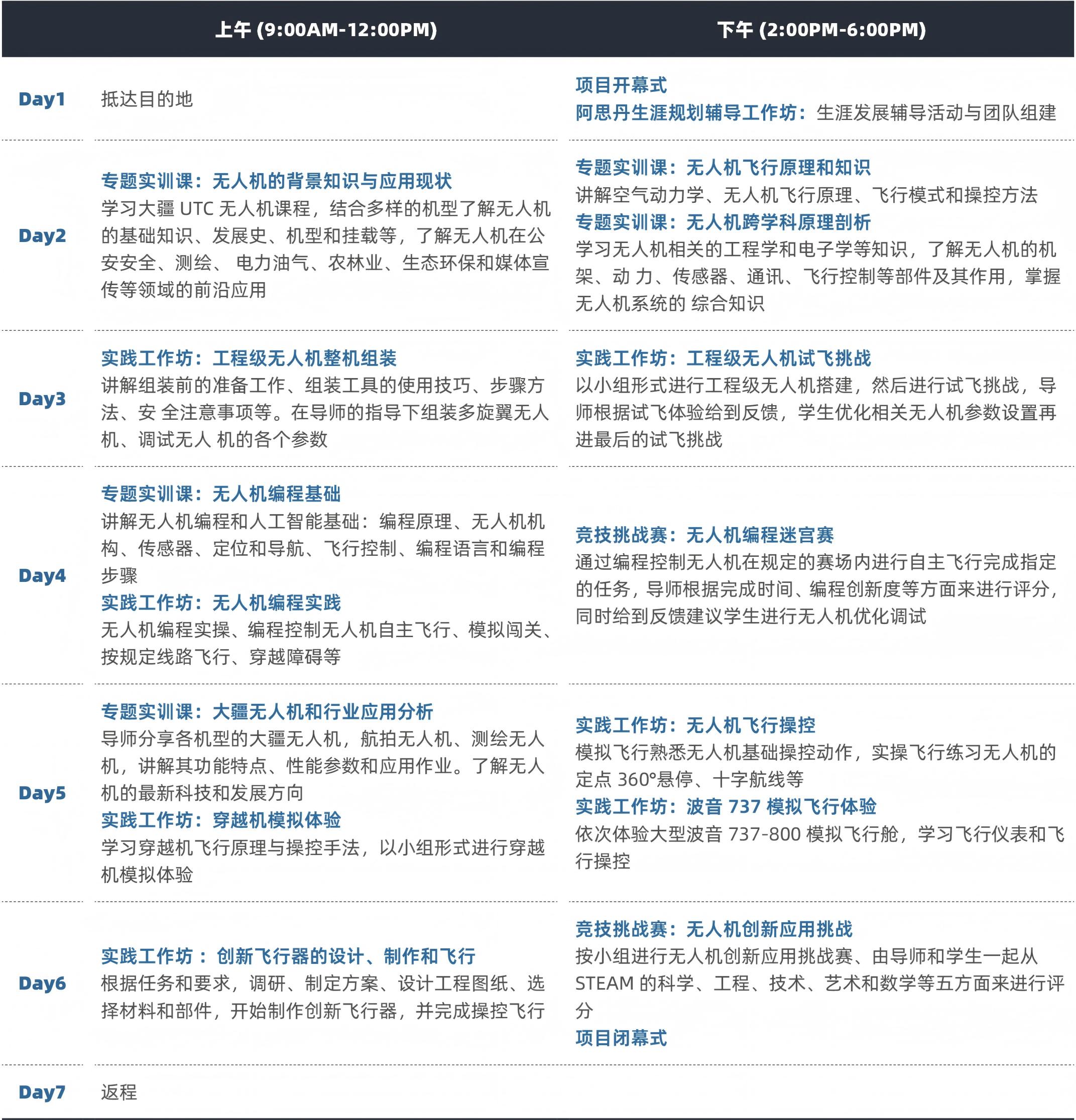 阿思丹联合大疆官方无人机应用技术培训中心 UTC 的上海校区推出无人机相关应用培训项目。给与同学们一个在专属无人机基地与领空进行沉浸式无人机学科知识与前沿应用的机会,动手进行无人机工程设计、制作组装、自主飞行、障碍竞速、编程实操等丰富实践,同时学生有机会体验大型波音 737-800 模拟飞行舱,学习穿越机飞行操控,最终完成无人机创新应用挑战赛,收获独特的工程方向专业实践与背景提升,优秀同学可获得导师签发的推荐信。