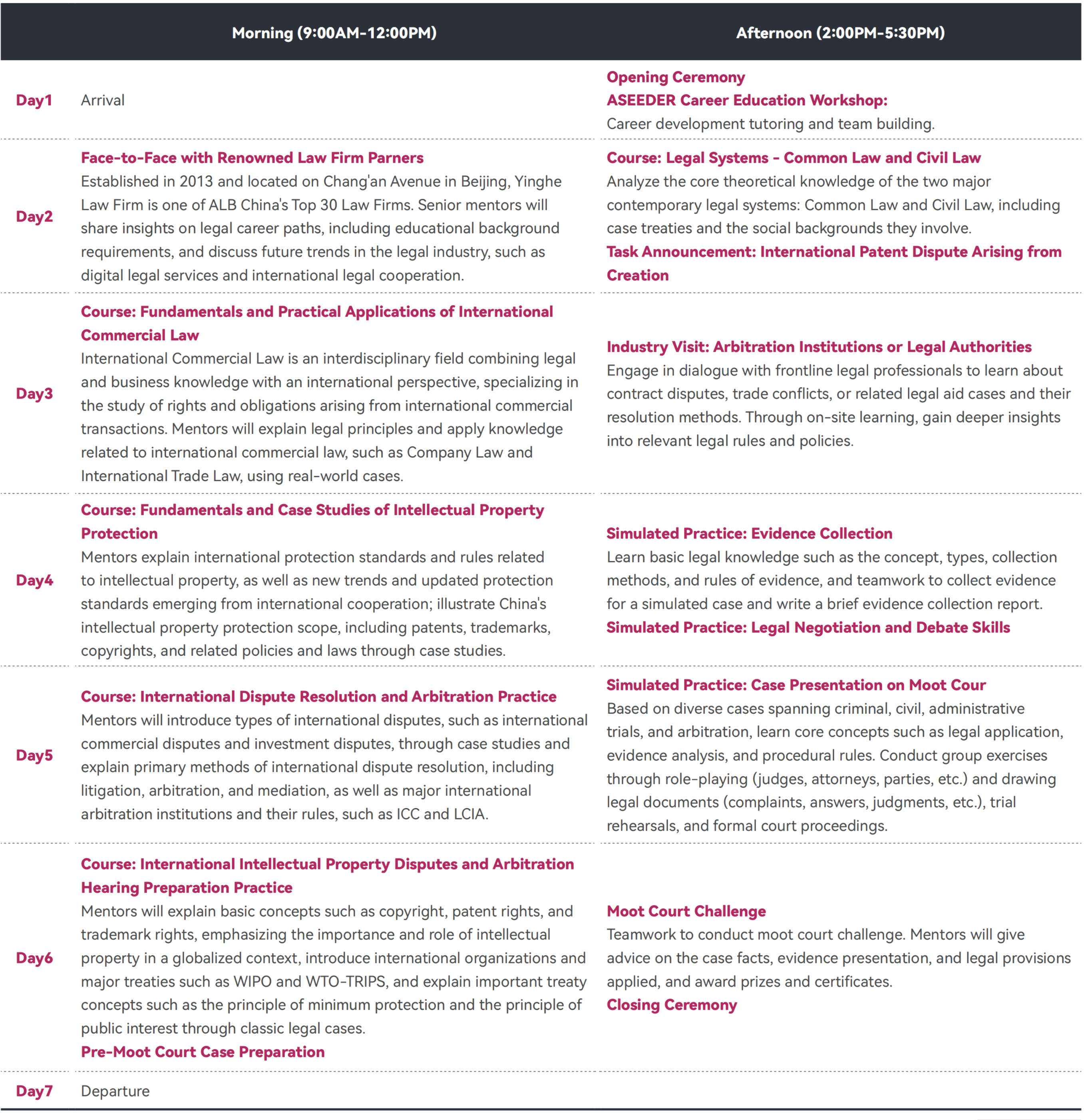 In the context of rapid globalization, legal issues such as cross-border transactions, investment protection, and international trade disputes are on the rise, leading to an increased demand for international legal talents. Consequently, university majors in related fields have become popular application choices. ASEEDER, in collaboration with Beijing Yinghe Law Firm, has launched the Yinghe Law Firm International Law & Intellectual Property Training program, offering an opportunity for students to engage in theoretical learning and practical training. Senior lawyers specializing in international commercial law and intellectual property rights will be invited to co-teach. Students will visit courts, participate in simulated procuratorial meetings to understand the functions of ordinary criminal procuratorial work, interpret legal cases, engage in simulated evidence collection and case analysis, and ultimately complete a moot court challenge. Upon completion, students will receive a Certificate of Participation issued by Beijing Yinghe Law Firm and a Certificate in Careers and Experiencing Work Short Course accredited by UCAS. Outstanding students will also receive a recommendation letter signed by their mentors.