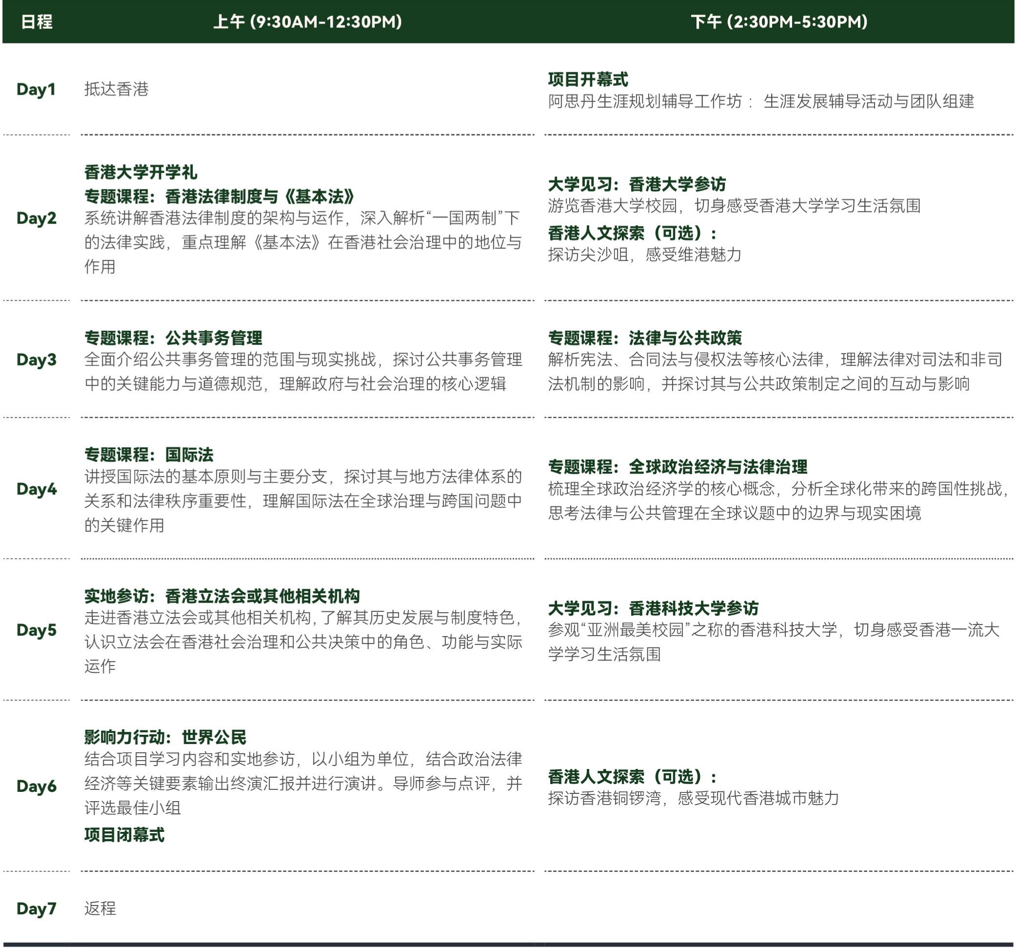 课程内容涵盖法律与公共管理的核心领域:从香港法律制度与《基本法》的架构,到国际法的基本原则与全球治理作用;从公共事务管理的现实挑战,到法律与公共政策的互动影响。学员将通过专题授课,理解法律如何塑造社会治理规则,以及公共管理如何在全球化背景下应对跨国性问题。此外,课程将前往香港法学相关机构实地参访,深入了解其在政府治理中的角色与功能。参访香港大学、香港科技大学,感受一流学府的学术氛围。