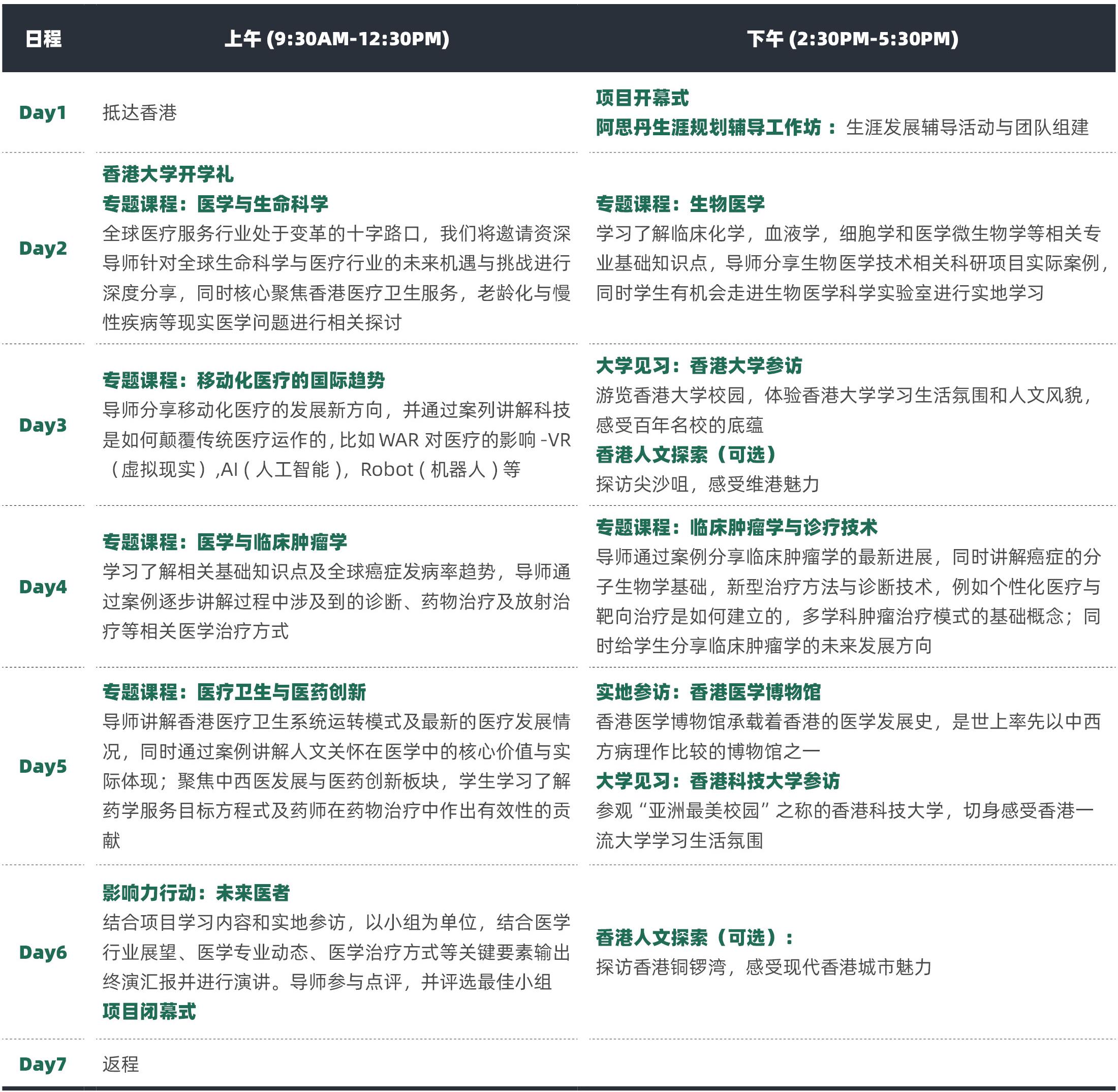 2026 年的 QS 世界大学排名,香港大学荣登全球十一名,亚洲第二。在医学、商科、人文等领域见长的香港大学是中国高等教育界一面独特的旗帜,享誉亚洲乃至世界。阿思丹联合香港大学专业进修学院(HKU SPACE) 开放香港大学定制名校课程项目,将世界名校的学术品质引入中学教育,让高中生提前沉浸式体验世界名校的学术课程,为未来升学做好准备。该方向精选香港大学医学与生命科学主题内容,主题涵盖全科医疗、生命科学、临床医学与药物治疗等相关医学课程,完成大学医学或生命科学等专业前期铺垫。同时学生学习生物医学基础课程,导师将围绕生物医学技术进行实际案例分享。我们还将去到香港医学博物馆,在导师的带领下进一步了解香港公共卫生的近代发展与医学历史。参与同学将收获香港大学专业进修学院官方颁发的参训证书,优秀同学将有机会获得港大导师签发的推荐信,助力大学申请。