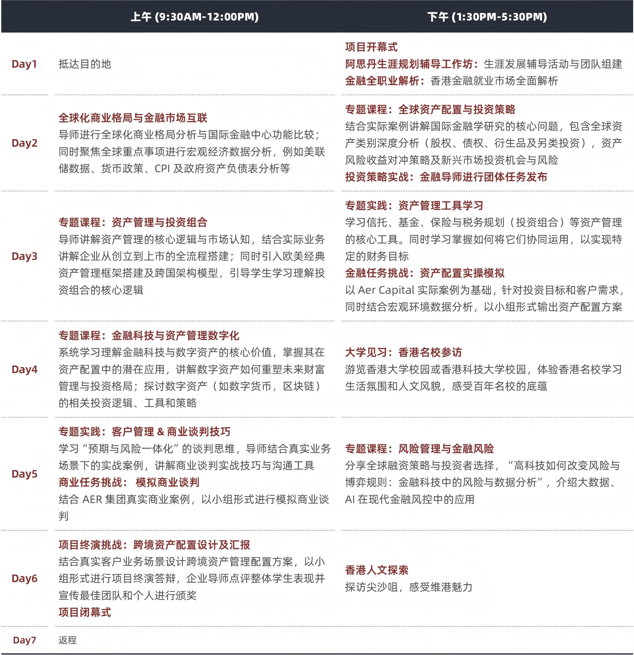 瑞银在《全球财富报告》中预测,到 2027 年亚太地区的超高净值人群预计达 123,000 人,占全球总数的三分之一,其中中国占比56% 将超过欧洲发展潜力巨大,由此衍生的全球资产配置与投资需求也日趋旺盛。基于此趋势,阿思丹联合在福布斯家族办公室 - 资产管理能力 Top10 的 Aer Capital 资产管理集团,聚焦金融投资,商业策略,金融科技,资产管理等热门专业,为对金融和商科感兴趣的同学提供极具分量的一线实践机会。项目力邀 Aer Captial 、新加坡(香港)銀行等行业顶尖机构高管联合授课,学习宏观数据分析,金融投资策略,金融风险管理等前沿金融课程,行业导师全面解析香港金融就业市场与金融行业未来热门趋势,进行资产配置实操与商业模拟谈判等团队挑战任务,最终完成跨境资产配置设计及汇报答辩。项目完成将获得 AER CAPITAL 企业签发官方项目参与证书,优秀学生有机会获得导师签发推荐信。