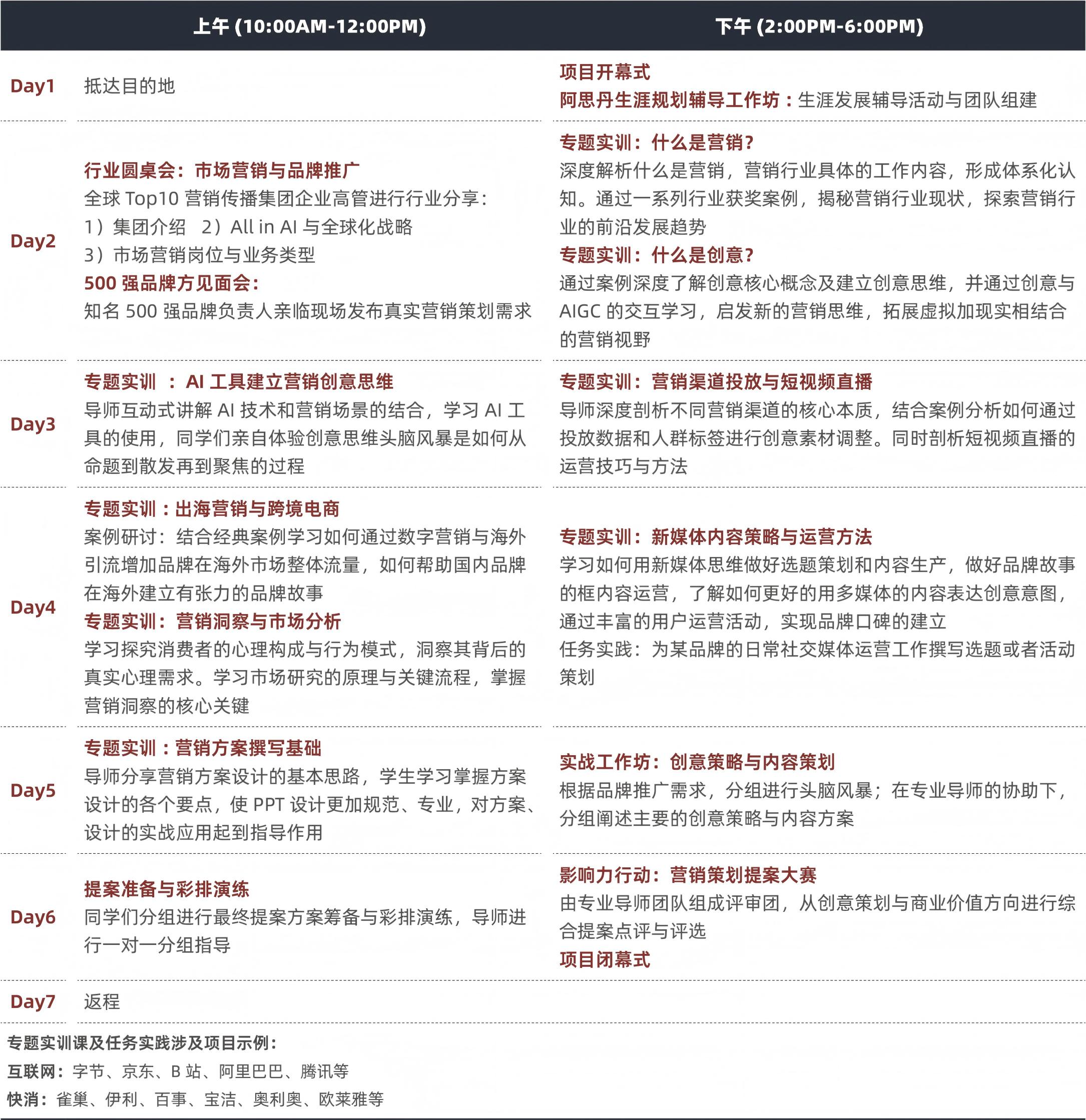 市场营销 (Marketing) 作为大学里面热门的专业之一,它是建立在行为经济学、管理学和现代信息技术等基础上的一门交叉学科。阿思丹联合全球 Top10 营销传播集团蓝色光标独家推出 -500 强品牌市场营销与创意策划项目。以知名 500 强企业营销策划为核心命题, 诚邀 500 强品牌代表发布真实品牌策划需求,由全球顶尖营销传播集团导师授课带领同学们完成从建立创意思维、进行营销洞察与市场分析、多媒体营销方案策划等营销全流程,在蓝色光标集团进行一线深入学习与见习,由大咖总监剖析知名 500 强企业真实案例进行全程实战教学,让学生们掌握一套符合行业最高标准的营销方法论和技能,完成知名 500 强品牌营销策划挑战,并收获蓝色 光标集团签发的项目实训证书。