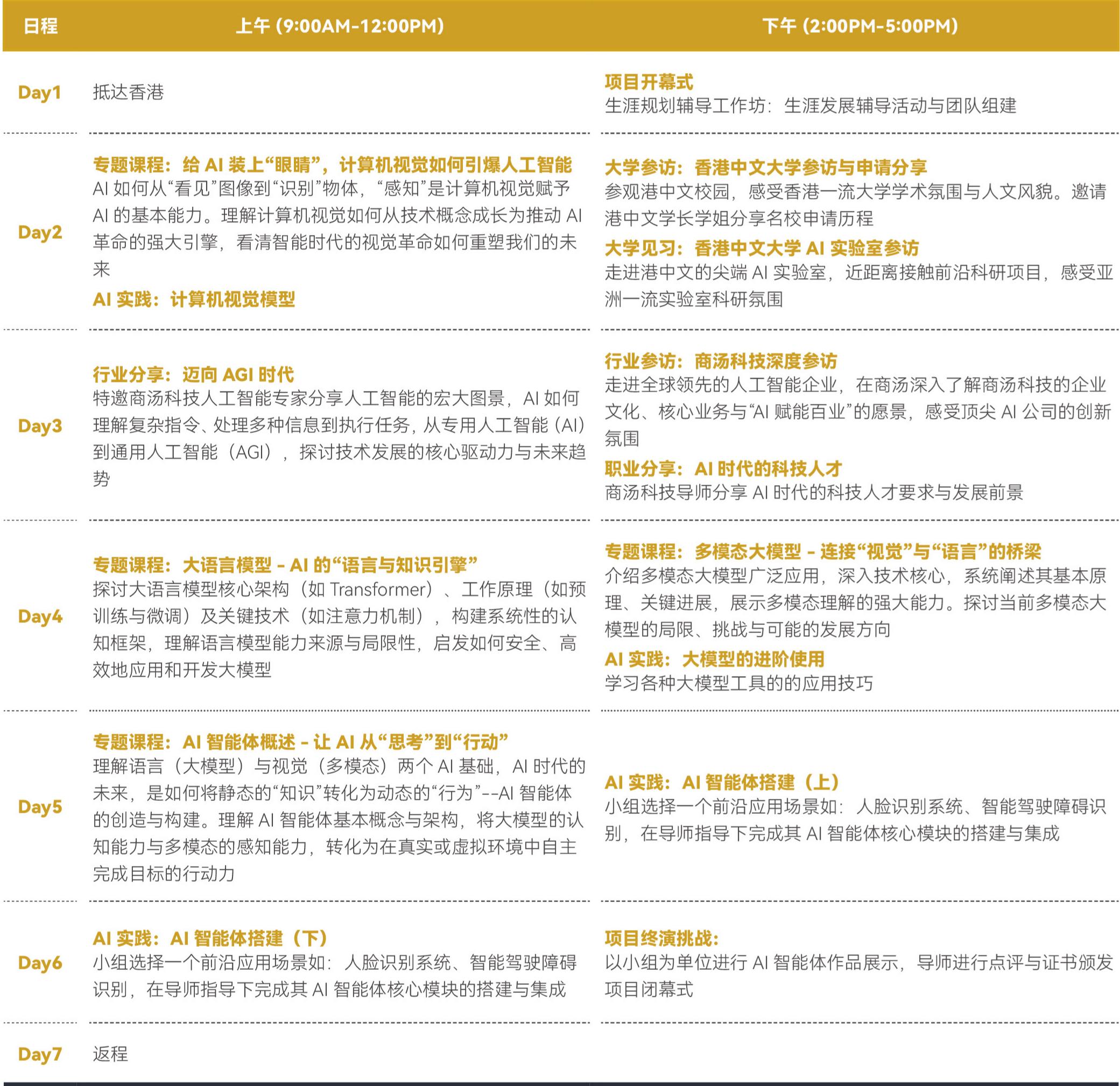 联合港中文主办部门以及其孵化的全球领先 AI 软件公司商汤科技,打造以“视觉感知 - 语言理解 - 智能决策”递进式 AI 名校课程项目,由港中文实验室研究人员和商汤科技专家联合授课,引领高中生,超越 AI 语言模型认知,深入探索下一代人工智能的核心形态——AI 智能体。聚焦于 AI 基于视觉感知与语言理解,亲身实践 AI 应用从感知世界到自主执行任务的完整智能闭环。