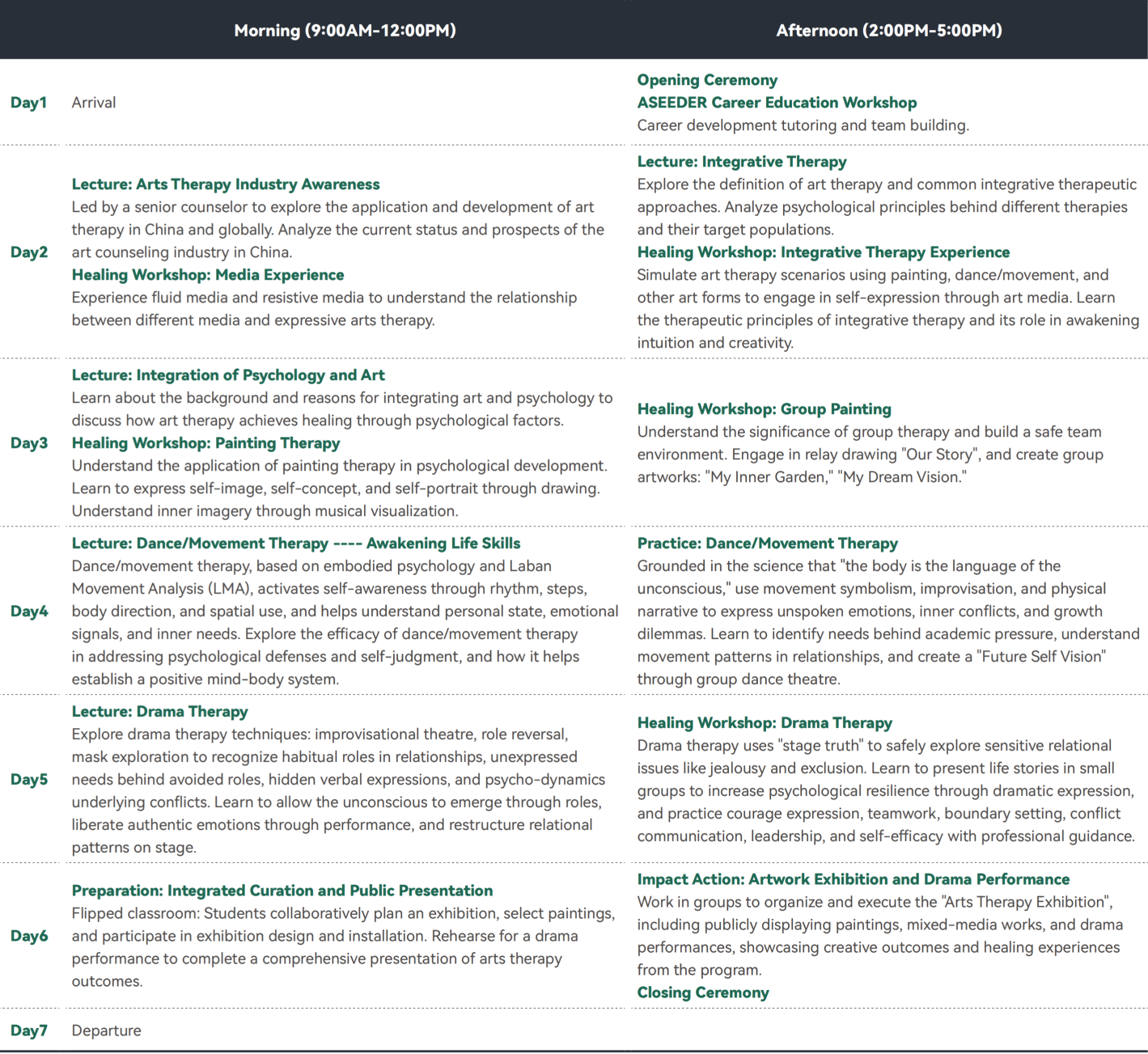 As mental health gains widespread attention, ASEEDER has partnered with Enis Psychological Consulting Organization, a leading psychology and arts therapy service in China, to design the Enis Creative Arts Therapy & Psychology program for high school students. The program closely addresses real-life issues faced by adolescents: academic pressure, self-identity, interpersonal difficulties, and career exploration. Starting with industry awareness and psychology fundamentals, the program gradually delves into core schools of arts therapy and ethical guidelines. Students will systematically learn the principles and applications of various therapeutic approaches, such as integrative therapy, dance/movement therapy, drama therapy, and more. Immersive “Healing” workshops offer hands-on multi-modal experiences: begin with “playing with media” for non-verbal expression; depict self-portraits and inner gardens through painting; connect with the body, release stress, and envision the future through dance; explore relationships, practice courage expression, and navigate conflict through role-play in drama; plan a art therapy exhibition, performing a drama piece, completing a full learning cycle from theory to practice, from experience to creation. The program is taught by faculty from Beijing Normal University, Zhejiang University, and other renowned institutions, blending cutting-edge concepts with clinical experience. Upon completion, participants will receive a participation certificate issued by Enis and a Certificate in Careers and Experiencing Work Short Course accredited by UCAS to enhance their university applications.