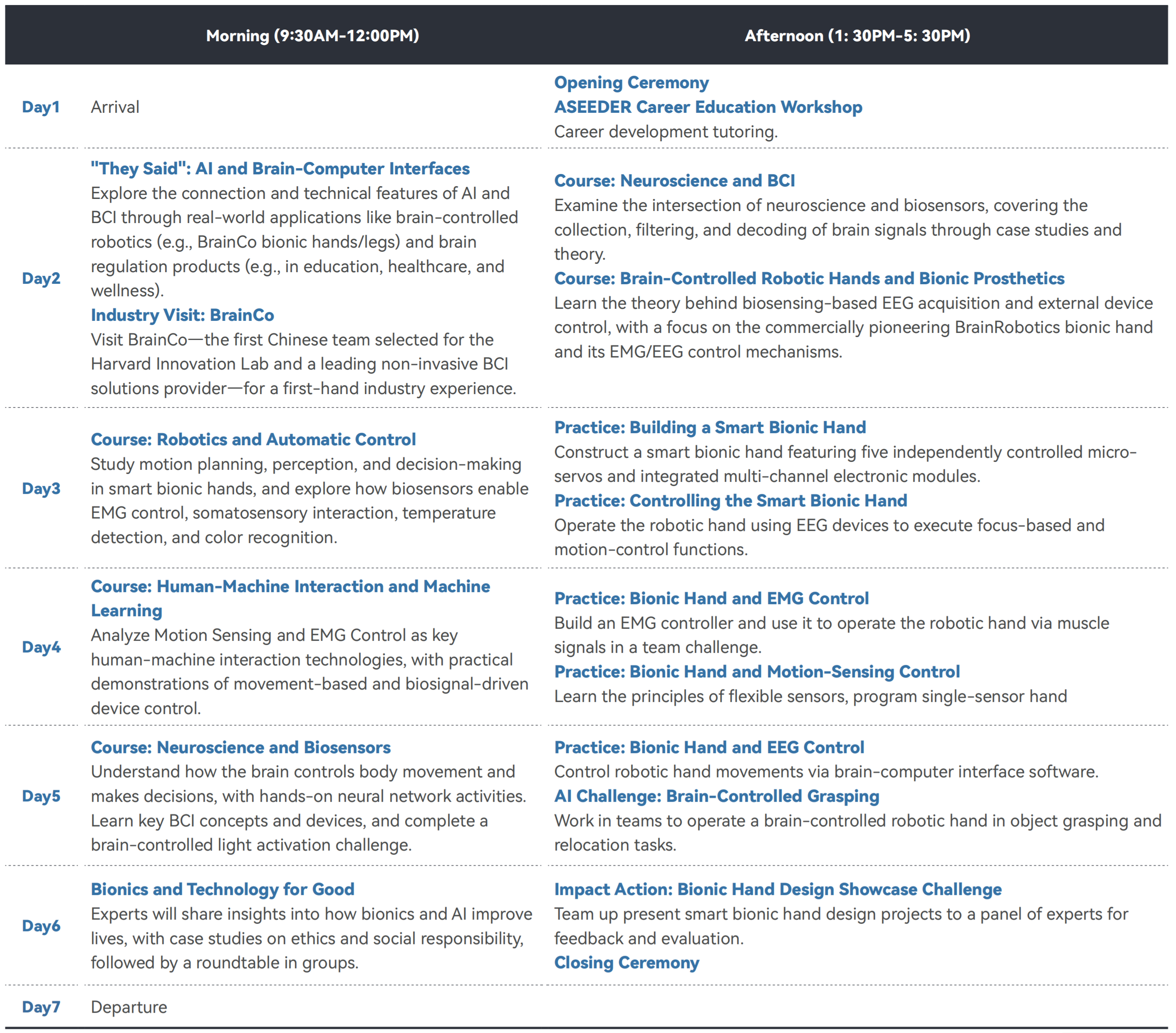 Brain-Computer Interface (BCI), a revolutionary human-machine interaction technology, establishes an efficient information transmission channel between the brain and external devices by directly decoding neural electrical signals. This groundbreaking technology, with its transformative potential, has become a strategic high point in global tech competition. Currently, BCI technology has moved beyond lab research and entered a critical phase of industrial development, driving soaring demand for specialized talent. Focusing on popular core fields such as AI, neuroscience, computer science, and biomedical engineering, ASEEDER has partnered with leading BCI company BrainCo to launch the "BrainCo brain-computer interface and artificial intelligence bionic hand program." BrainCo, the first Chinese team selected for the Harvard Innovation Lab, is committed to becoming a world-leading provider of non-invasive BCI solutions. The program invites industry experts to provide frontline instruction, and students will work in groups to build and control intelligent bionic hands through multi-sensor systems. They will also study neuroscience and BCI technology, ultimately using BCI applications to operate robotic hands in program challenges. Upon completion, students will receive an official Certificate of Participation and a Certificate in Careers and Experiencing Work Short Course accredited by UCAS. Outstanding students may also receive recommendation letters.