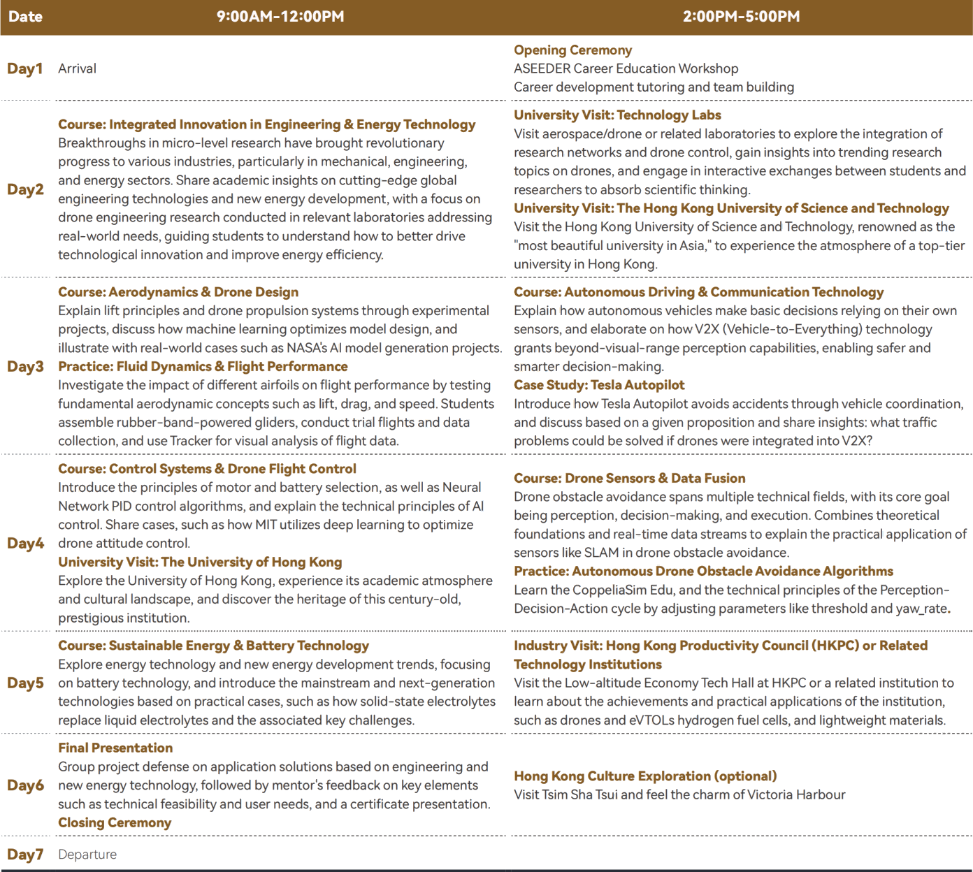 Taking a comprehensive look at the current trend of global technological innovation and development, meeting the needs of sustainable and high-quality human development has become a central focus worldwide. Correspondingly, engineering innovation and new energy technologies have emerged as crucial drivers for future technological advancement. Concurrently, breakthroughs in microscopic research have brought revolutionary progress to multiple industries, particularly creating new opportunities in fields such as energy, machinery, and engineering. This program invites HKUST’s engineering professors to deliver lectures on engineering, electronic engineering, and new energy technologies, covering topics such as aerodynamics and drone flight control, sustainable energy, and battery technology. Furthermore, students will assemble powered gliders and conduct visual analysis of flight data, as well as tackle the challenge of practicing autonomous drone obstacle avoidance algorithms. Through the combination of theory and hands-on practice, students will gain an in-depth understanding of corresponding disciplines, and will also have an opportunity to visit tech enterprises or institutions to explore the advanced engineering technologies of Hong Kong.