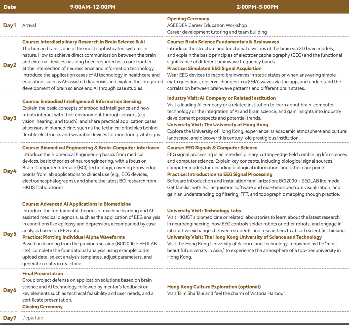 The human brain is one of the most sophisticated systems in nature. How to achieve direct communication between the brain and external devices has long been regarded as a core frontier at the intersection of neuroscience and information technology. With the global market size exceeding hundreds of billions of USD in 2025, its related fields are reshaping the global technology landscape at an annual growth rate of over 40%. Majors such as brain science, biomedical engineering, and AI have become popular academic choices. This program invites HKUST instructors specializing in bioengineering to deliver lectures on brain science, brain-computer technology, biomedical engineering, and computer science, covering topics such as the fundamentals of brain science and brainwaves, biomedical engineering, and brain-computer interfaces. Students will engage in practical activities such as simulated EEG signal acquisition and EEG signal processing. Through hands-on practice and deep learning, they will explore subjects like brain science, biomedical engineering, and computer science, and have an opportunity to visit tech enterprises or institutions to explore leading technologies and future developments in brain-computer technology or biomedical engineering in Hong Kong.