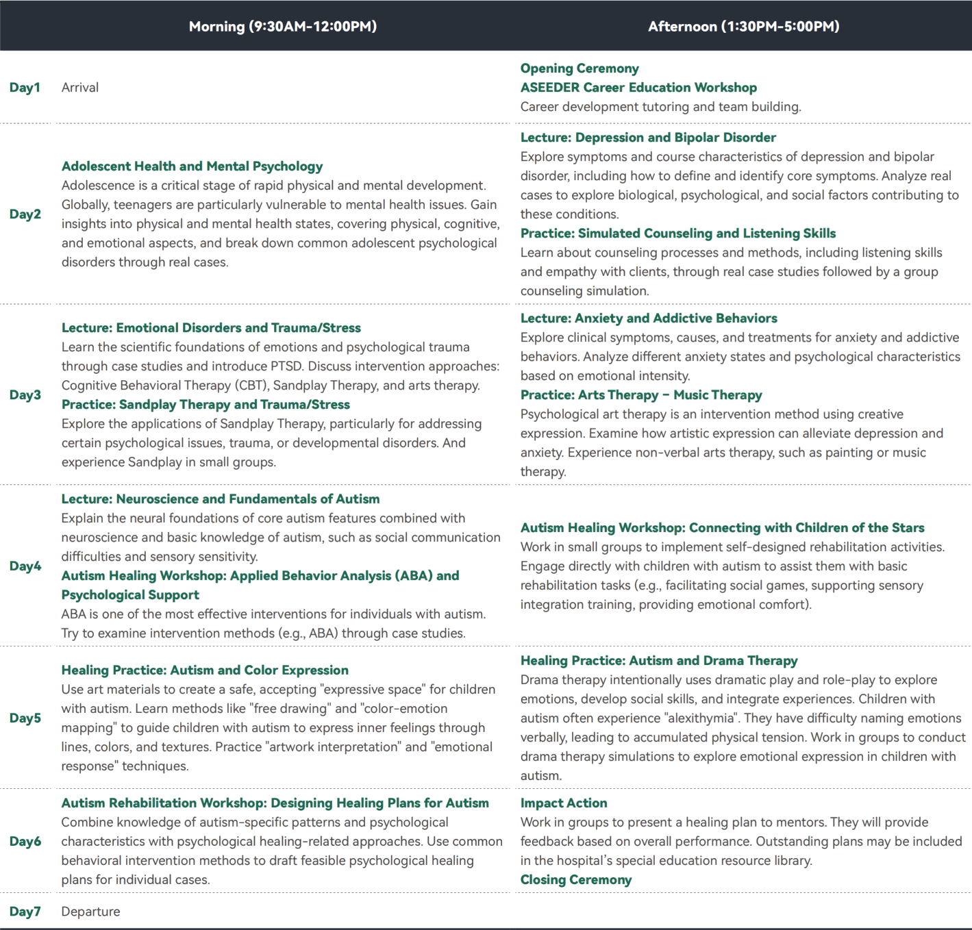 Adolescence is a critical stage of rapid physical and mental development, marked by multiple growing pains. Globally, teenagers are particularly vulnerable to mental health issues. ASEEDER, in partnership with Rainbowpen, has exclusively designed the Adolescent Psychology & Autism Treatment Training program, focusing on the mental development of young people. The program, delivered by the Executive Director of Rainbowpen and certified instructors from the UCLA Department of Biobehavioral Sciences, focuses on common psychological disorders in adolescents, including depression, bipolar disorder, emotional disorders, trauma and stress, anxiety, and addictive behaviors. Through real case studies and multiple psychology practices, such as simulated counseling, arts therapy, and Sandplay Therapy, participants will explore the world of psychology in an engaging, hands-on way. Autism Spectrum Disorder (ASD) is the disease with the fastest-growing number of patients worldwide. ASD Children are often called “children from the stars” due to their unique clinical presentations. Participants will have the opportunity to visit a special children's institution in Shanghai and design a rehabilitation plan to support children with autism. Upon completion, participants will receive a program certificate issued by Rainbowpen. The best individuals may also obtain recommendation letters signed by their mentors.