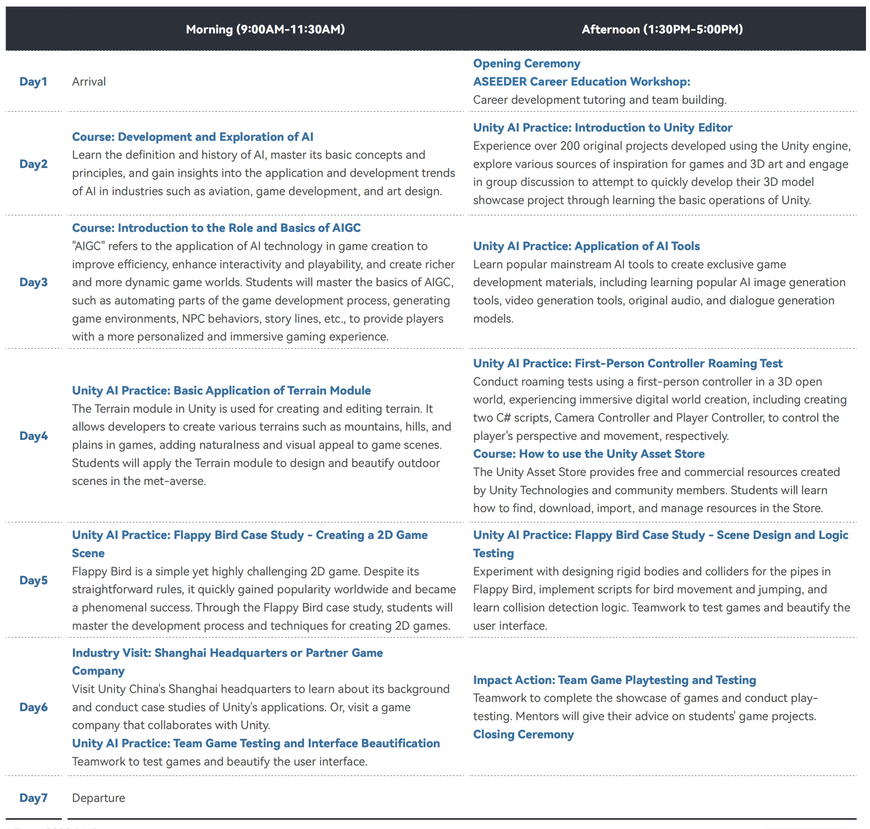 students. Through this program, students will learn and master the basic concepts, principles, and application areas of AI and Unity. They will utilize mainstream AI tools, combined with well-known game cases and Unity engine tools, to develop and design 3D games, ultimately completing a game project. Participating students will receive a Certificate of Participation from Unity, as well as a Certificate in Careers and Experiencing Work Short Course accredited by UCAS. Outstanding students will have the opportunity to obtain a recommendation letter signed by Unity mentors to support their university applications.