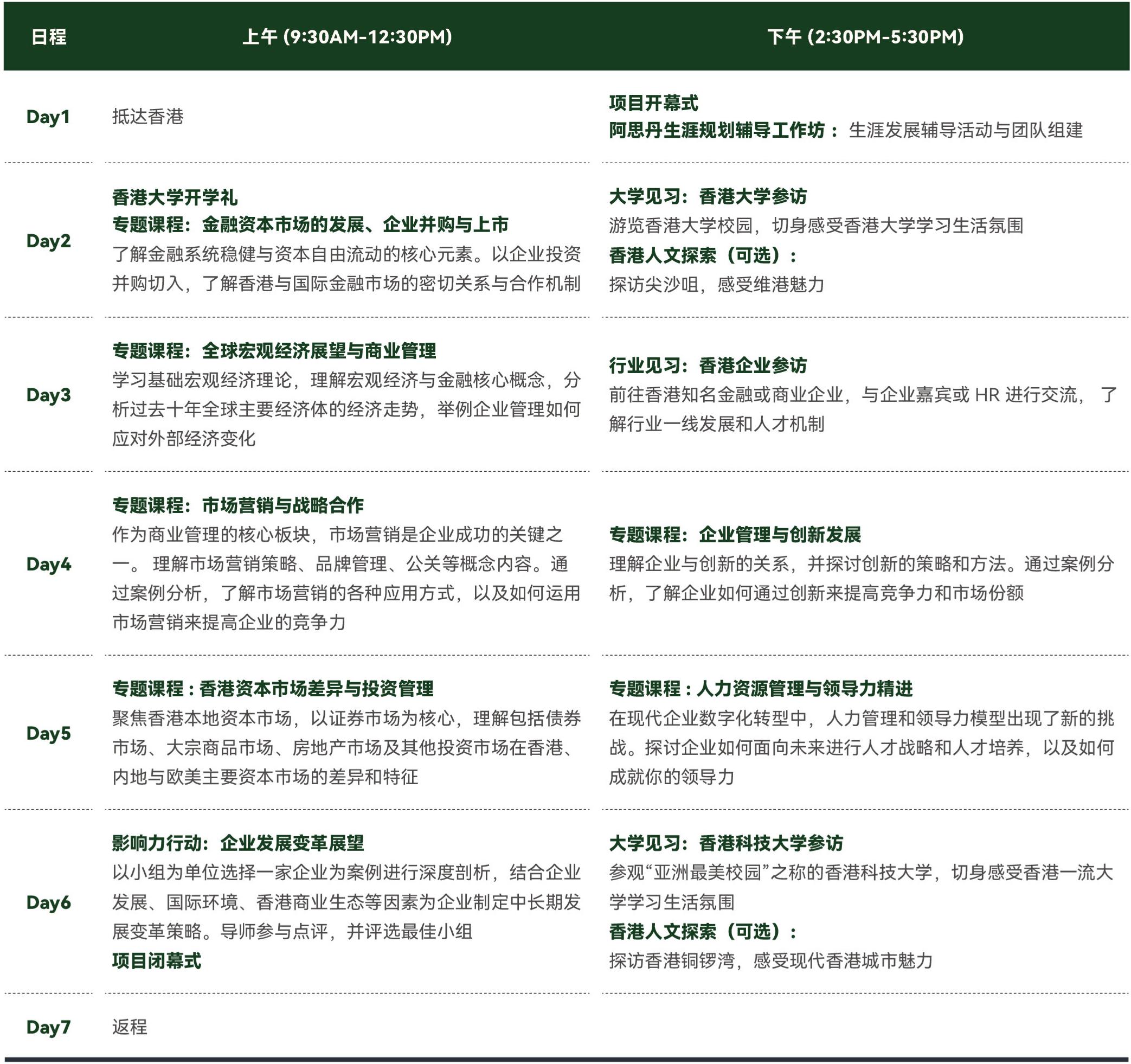 管理学是构建企业可持续运营的战略骨架与运营支柱,而金融市场则是驱动企业发展、配置资本并最终实现价值的外部引擎。在全球经济深度融合的背景下,企业内部精细化运营与其在外部资本市场上的表现日益紧密相连,构成了现代商业价值创造的双轮驱动系统。 本全新综合课程深度融合商业管理学与金融经济学两大核心领域,从全球价值链视角出发,系统解析企业的内部治理与外部资本运作。第一部分聚焦企业内部的高效运营与战略管理,涵盖组织行为、人力资源管理、战略领导力及供应链管理。第二部分则切入金融市场与企业资本运作视角,致力于解析资本市场如何赋能企业发展,涵盖企业融资、投资管理、估值与并购重组以及香港在全球金融市场中的独特地位。项目还设置学术参访环节,学员将走进香港大学、香港科技大学参观,前往香港金融企业与金融机构导师进行面对面交流,从学术与实践视角深化对学科的认知。