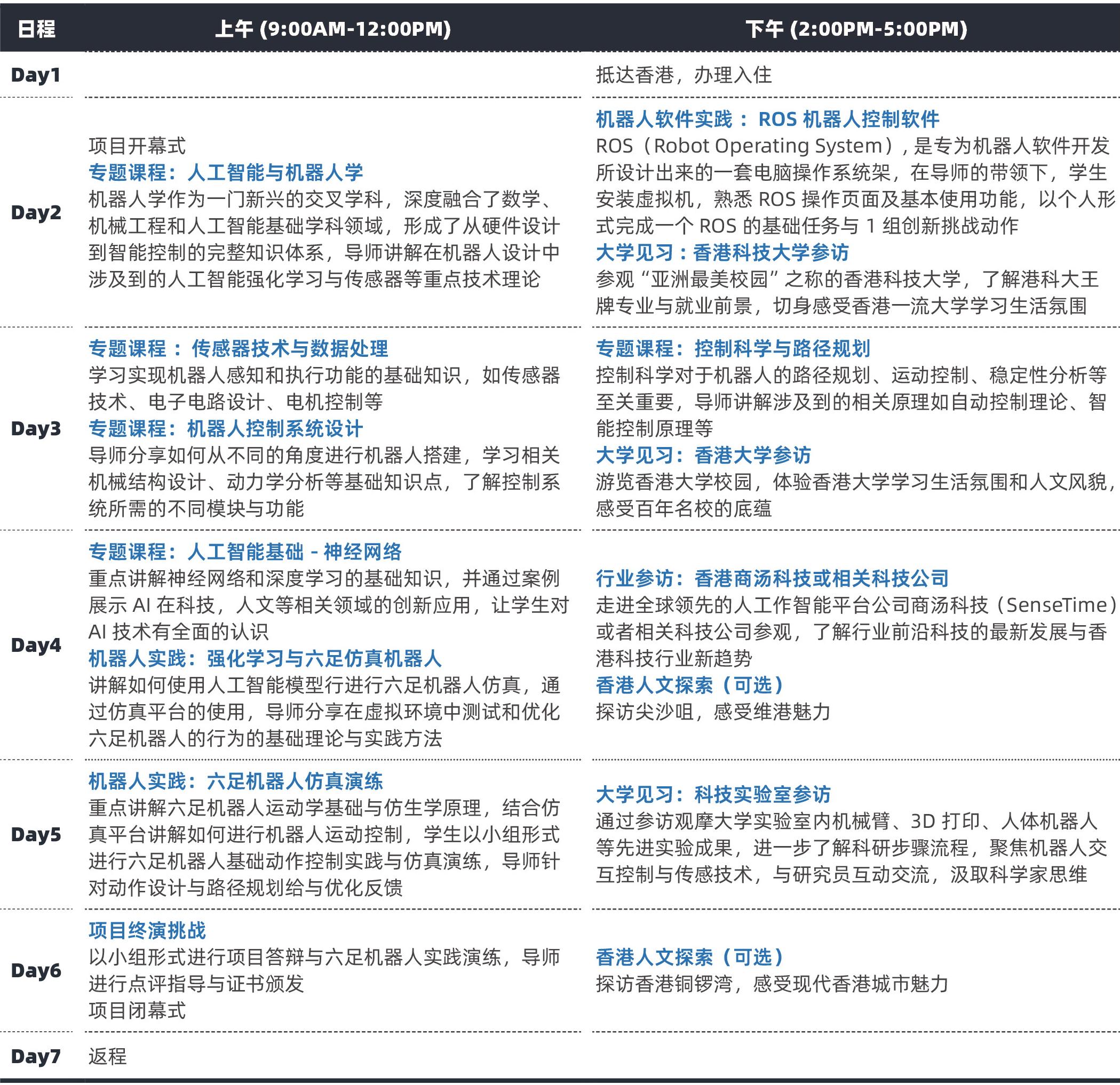 随着人工智能科技的进步,机器人逐渐出现在各行各业中,比如工业制造、医疗、农业、服务业等。机器人技术的发展在很大程度上提升了生产效率,也将改变人类的生活方式。智能化也将是机器人发展的必经趋势,伴随着人工智能技术的不断升级,机器人领域的发展也迎来了新的机遇。本项目联合香港科技大学郑家纯机器人研究院导师,带领同学们在香港科技大学系统学习机器人相关基础理论知识,如机器人控制系统设计,传感器技术与数据处理等专题课程;学生进行 ROS 软件仿真演练,六足机器人系统设计,同时结合人工智能模型行进行六足机器人仿真演练实战与创意动作控制挑战,通过实践深度学习了解机器人学的涉及到的数学、机械工程、电子工程、人工智能等跨学科知识。学生同时有机会走进香港人工智能科技名企,了解行业前沿科技的最新发展与香港科技行业新趋势。