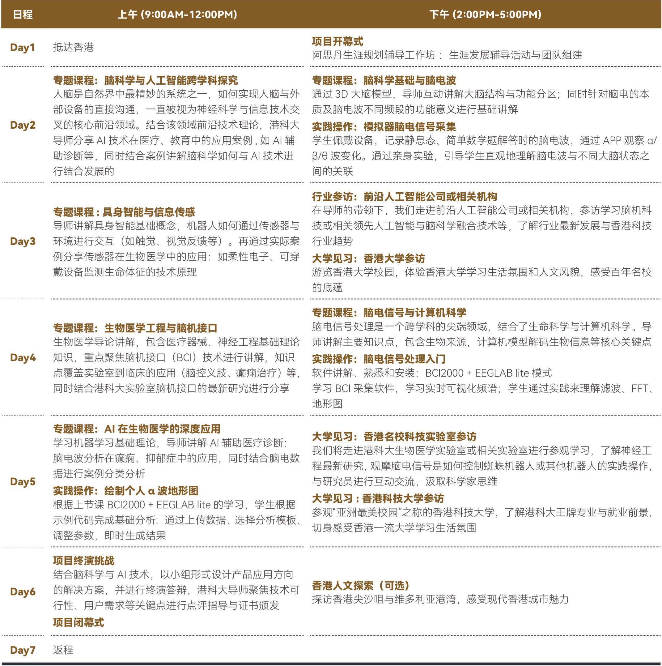 人脑是自然界中最精妙的系统之一,如何实现人脑与外部设备的直接沟通,一直被视为神经科学与信息技术交叉的核心前沿领域,其专业相关领域以年均超 40% 的增速重构着全球科技版图,2025 年全球市场规模已突破千亿美元。与之对应的脑科学,生物医学工程,人工智能等专业也成为热门的专业选择,本项目邀请生物工程领域导师专题授课,带领学生们学习脑科学,脑机科技,生物医学工程,计算机等相关理论课程,如脑科学基础与脑电波,生物医学工程与脑机接口等专题课程;同时学生进行模拟器脑电信号采集,脑电信号技术处理等实践,通过实践深度学习了解相对应的专业如脑科学,生物医学工程,计算机等学科知识。学生同时有机会前往香港领先科技企业或机构,探索脑机科技或生物医学工程在香港的前沿技术与未来发展。