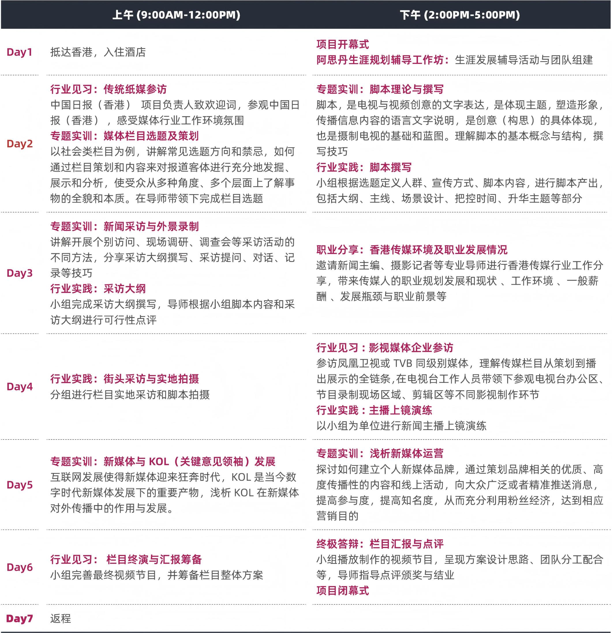 《China Daily》是中国国家英文日报,创刊于 1981 年,作为是中国走向世界、世界了解中国的重要窗口,是目前国外媒体转载率最高的中国报纸。阿思丹联合中国日报( 香港)为高中生提供由权威资深媒体人班底量身打造的进阶媒体实战体验。项目全程在 中国日报( 香港)办公区实训,多维度全面提升学员的新闻传媒方向专业能力,亲身经历从选题策划、脚本撰写、采访拍摄、录制剪辑全过程。同时,学员将有机会深度参访华语电视媒体巨头凤凰卫视或 TVB 等同类企业,了解影视媒体日常运作,体验模拟播报乐趣,感受华语媒体的包容与开放。参与学生将获得 中国日报(香港)签发的项目实践证明,以及 UCAS 官方推荐的阿思丹“职业发展与生涯能力规划”证书,优秀同学将有机会获得导师签发的推荐信,助力大学申请。