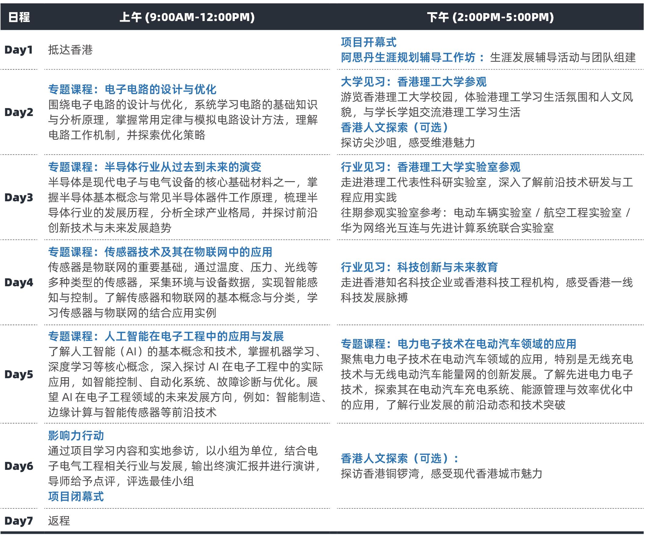 电子电气工程(EEE)是研究电能的生成、传输、控制与应用的学科,也是工程类专业中是最大的领域之一,它在能源、电力、通信、自动化、消费电子、航空航天等行业中有广泛应用,推动着 5G、物联网、智能制造等新兴技术的发展。项目聚焦电子电气工程专业,帮助学生搭建从基础理论到前沿技术的认知框架。课程内容围绕电子电气工程核心领域展开,从基础电子电路设计到其核心材料之一半导体的概念与发展,分析人工智能如何赋能电子工程领域,及电动汽车行业中的创新应用。项目还将带领学生走进香港理工大学的前沿实验室,走访香港知名科技企业或机构,近距离了解行业技术转化、产品研发及企业运作等实际情况。通过理论学习、行业剖析与实地参访相结合的方式,系统梳理电子电气工程专业的学习方向与职业发展路径。参与同学将获得香港理工大学校级研究中心的参训证书以及 UCAS 官方推荐的 ASDAN“职业发展与生涯能力规划”证书,优秀同学将收获香港理工大学导师签发的推荐信,助力大学申请。